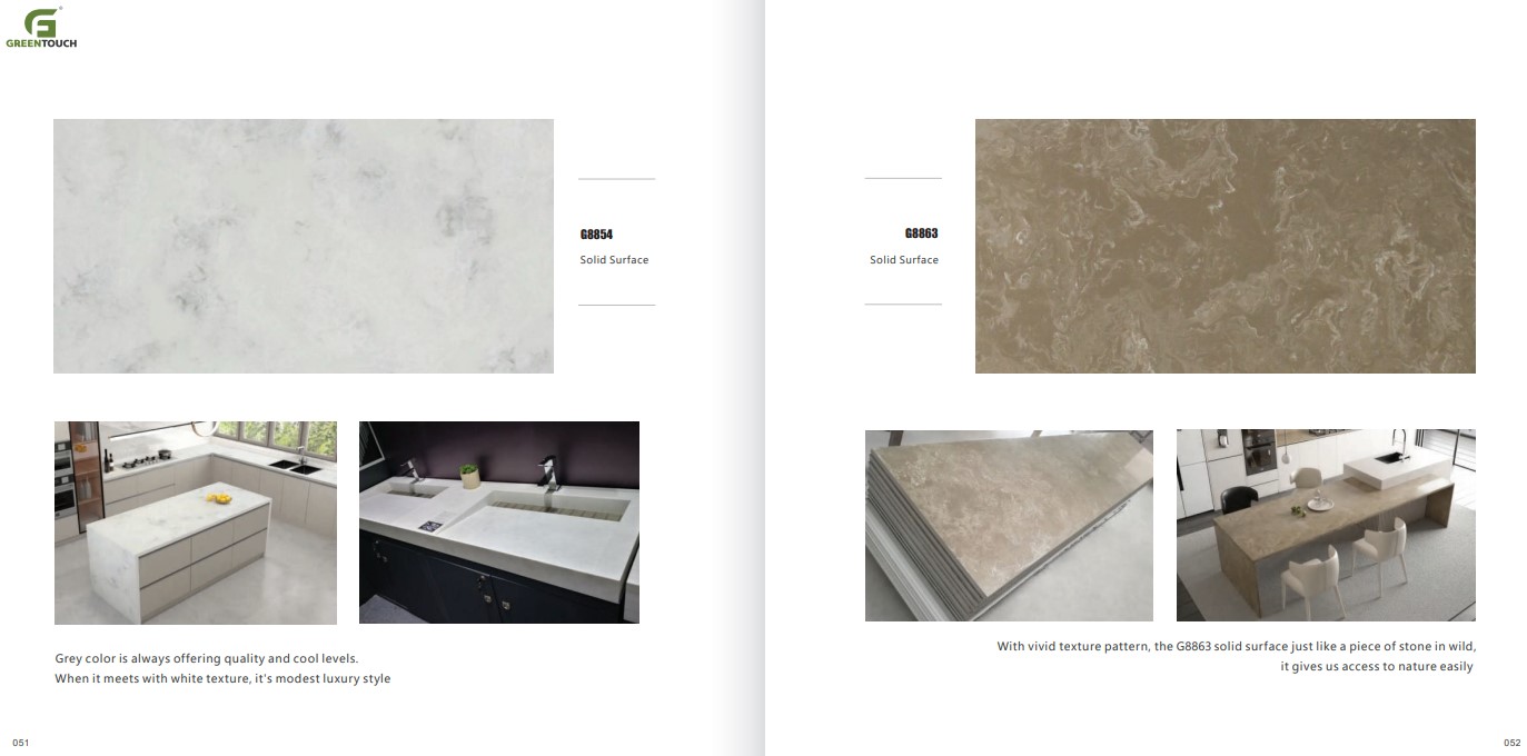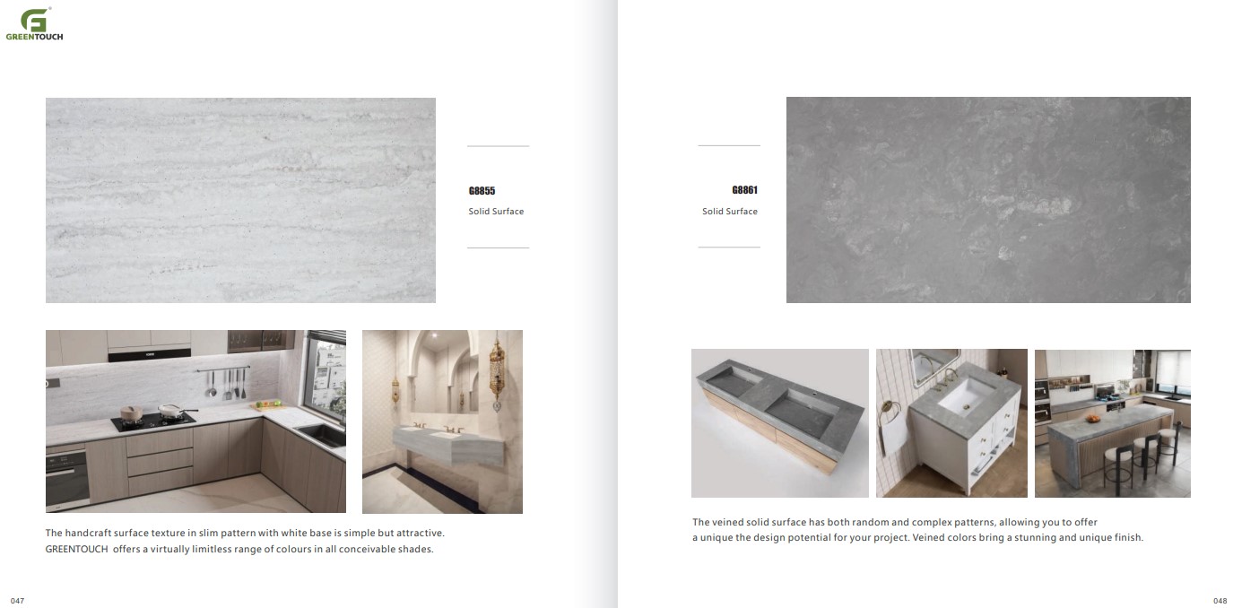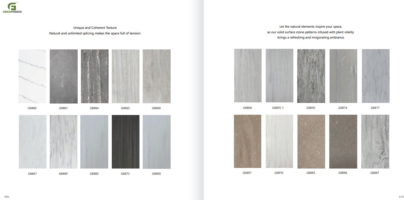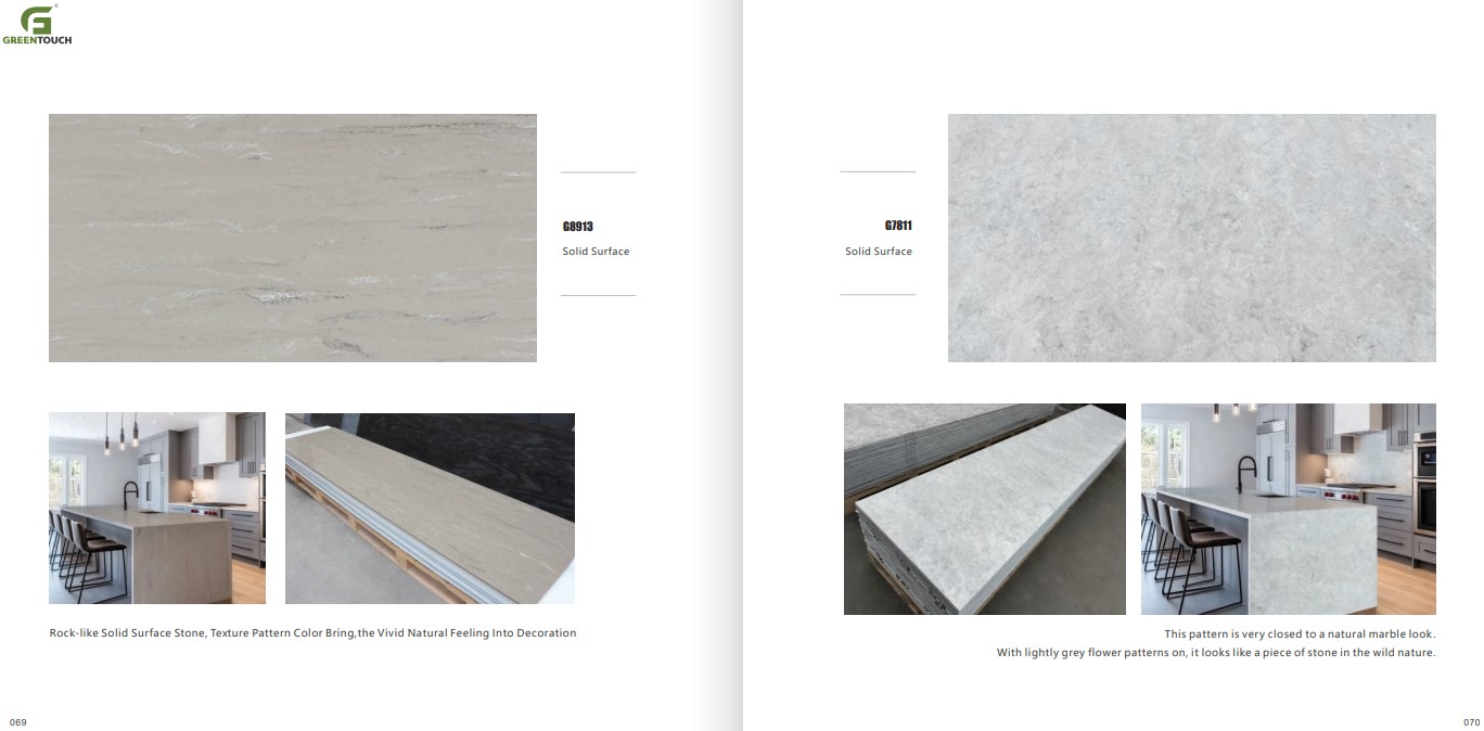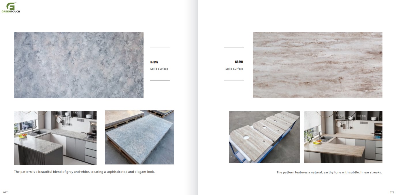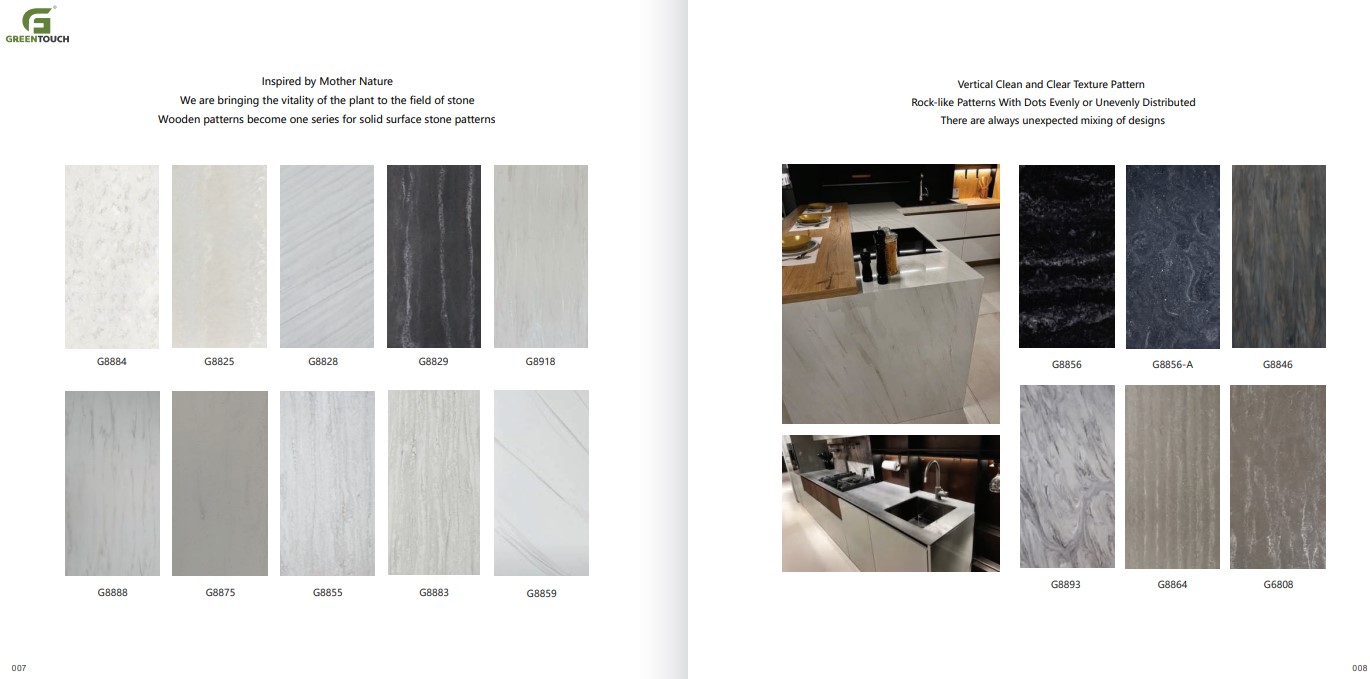 หินสังเคราะห์ยี่ห้อ GREENTOUCH Solid Surface ทำจากอคิลิค 100% ไม่ซึมน้ำ ไม่มีรูพรุน ไม่เป็นที่เพาะเชื้อราแบคทีเรีย ทนสารเคมี สวยงามไร้รอยต่อ มีลวดลายสีสันหลากหลาย
