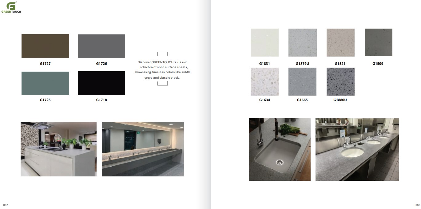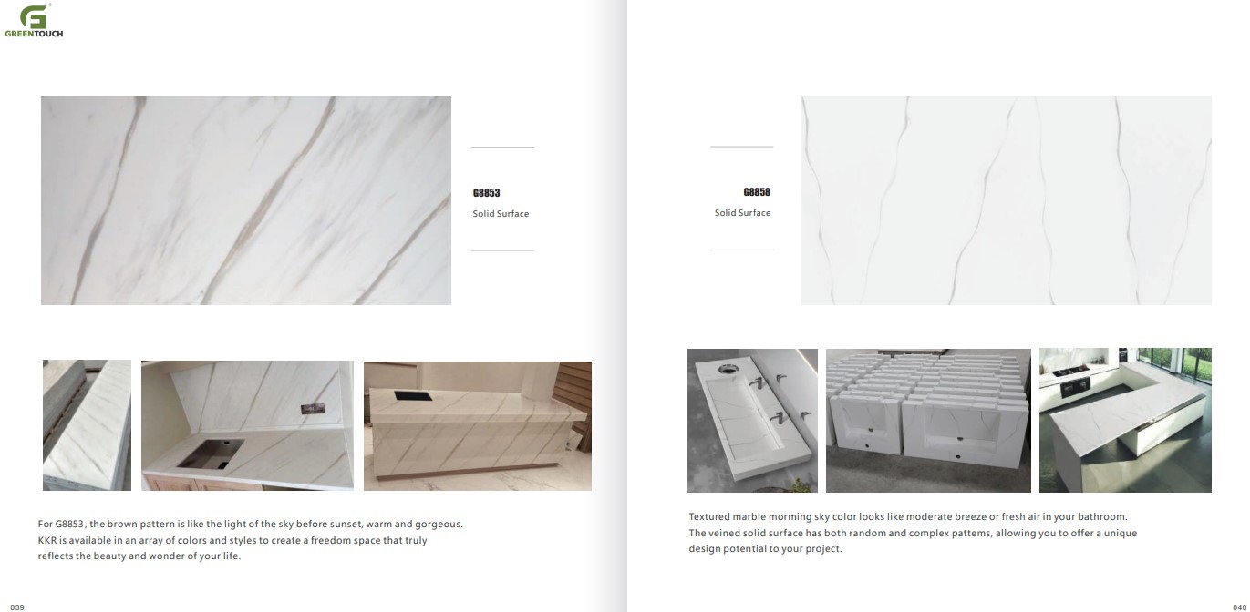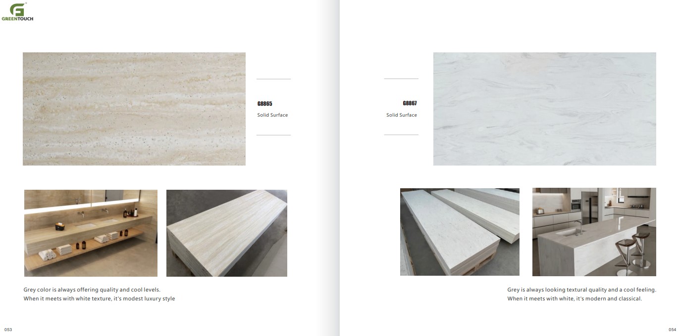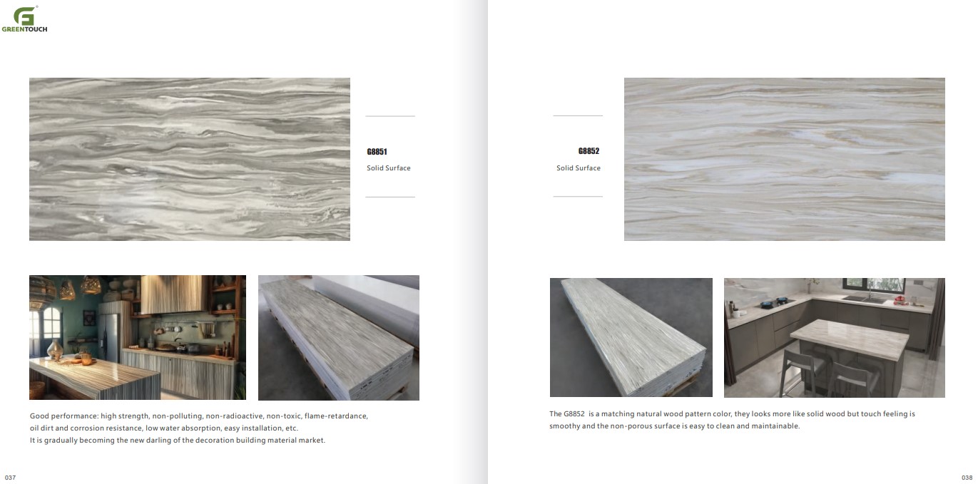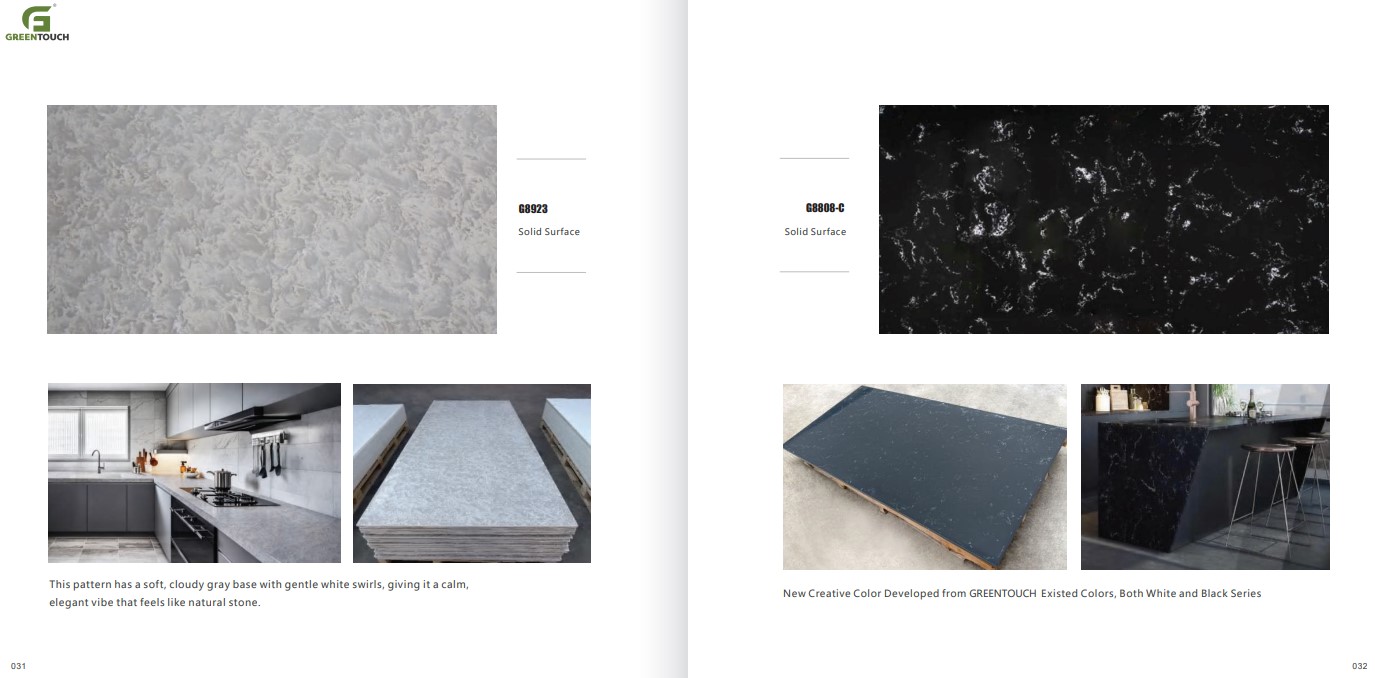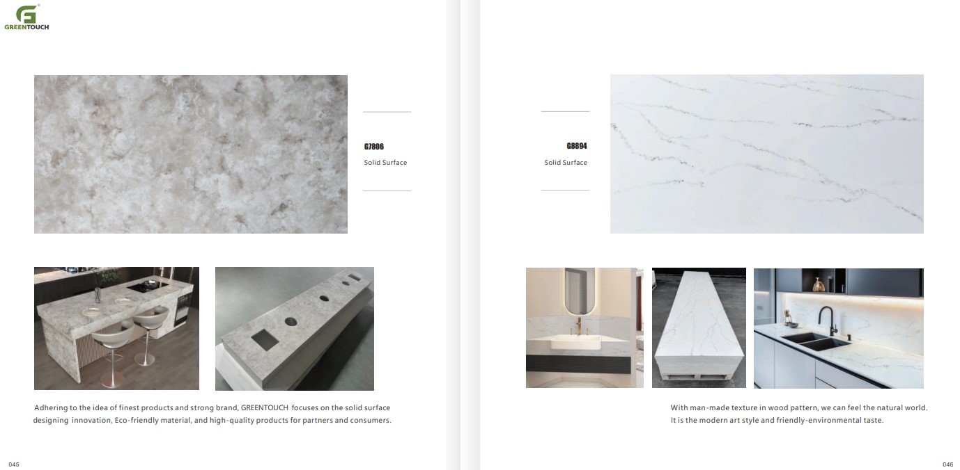 หินสังเคราะห์ยี่ห้อ GREENTOUCH Solid Surface ทำจากอคิลิค 100% ไม่ซึมน้ำ ไม่มีรูพรุน ไม่เป็นที่เพาะเชื้อราแบคทีเรีย ทนสารเคมี สวยงามไร้รอยต่อ มีลวดลายสีสันหลากหลาย