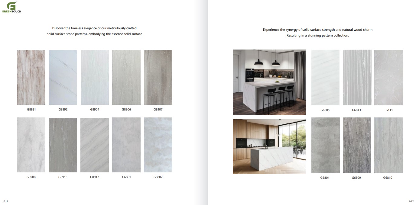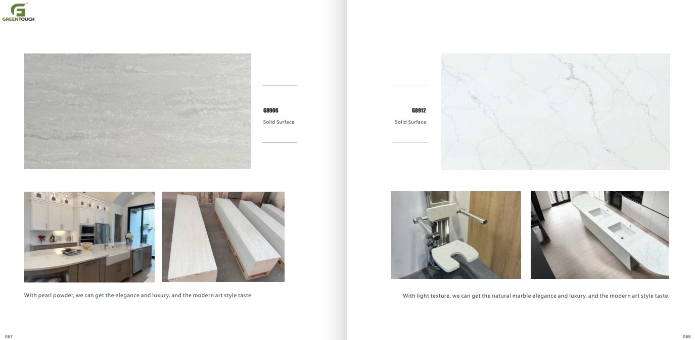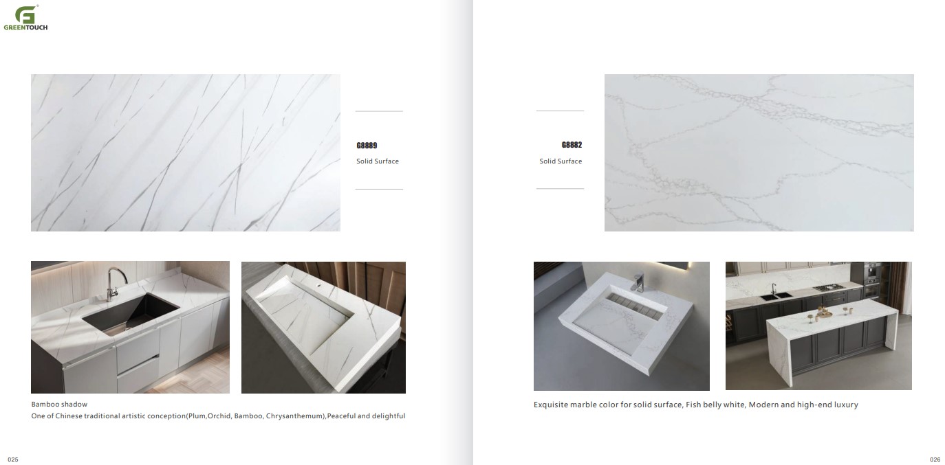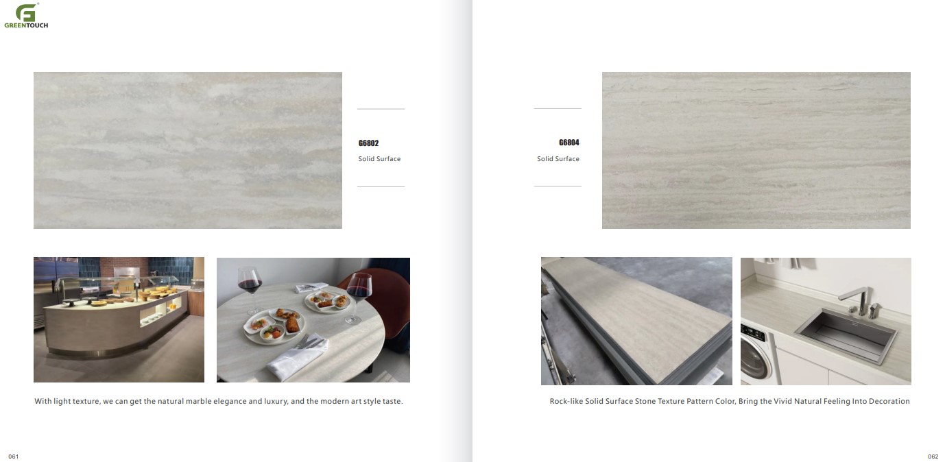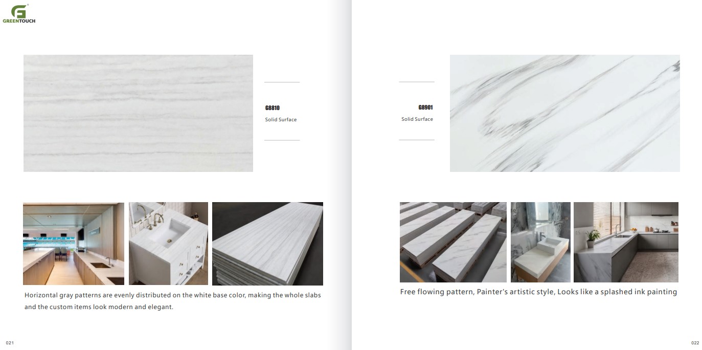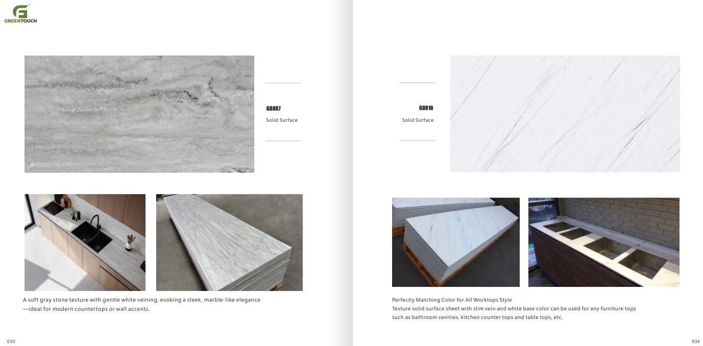 หินสังเคราะห์ยี่ห้อ GREENTOUCH Solid Surface ทำจากอคิลิค 100% ไม่ซึมน้ำ ไม่มีรูพรุน ไม่เป็นที่เพาะเชื้อราแบคทีเรีย ทนสารเคมี สวยงามไร้รอยต่อ มีลวดลายสีสันหลากหลาย