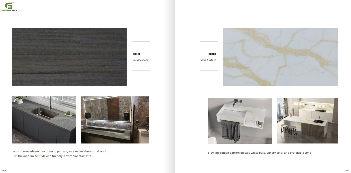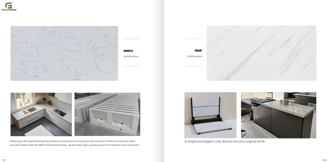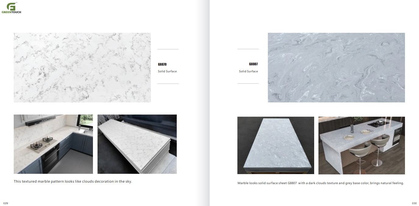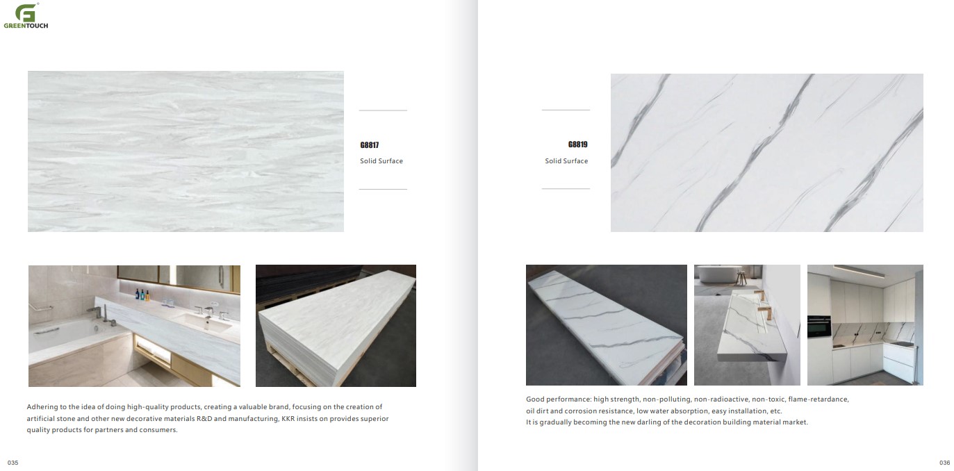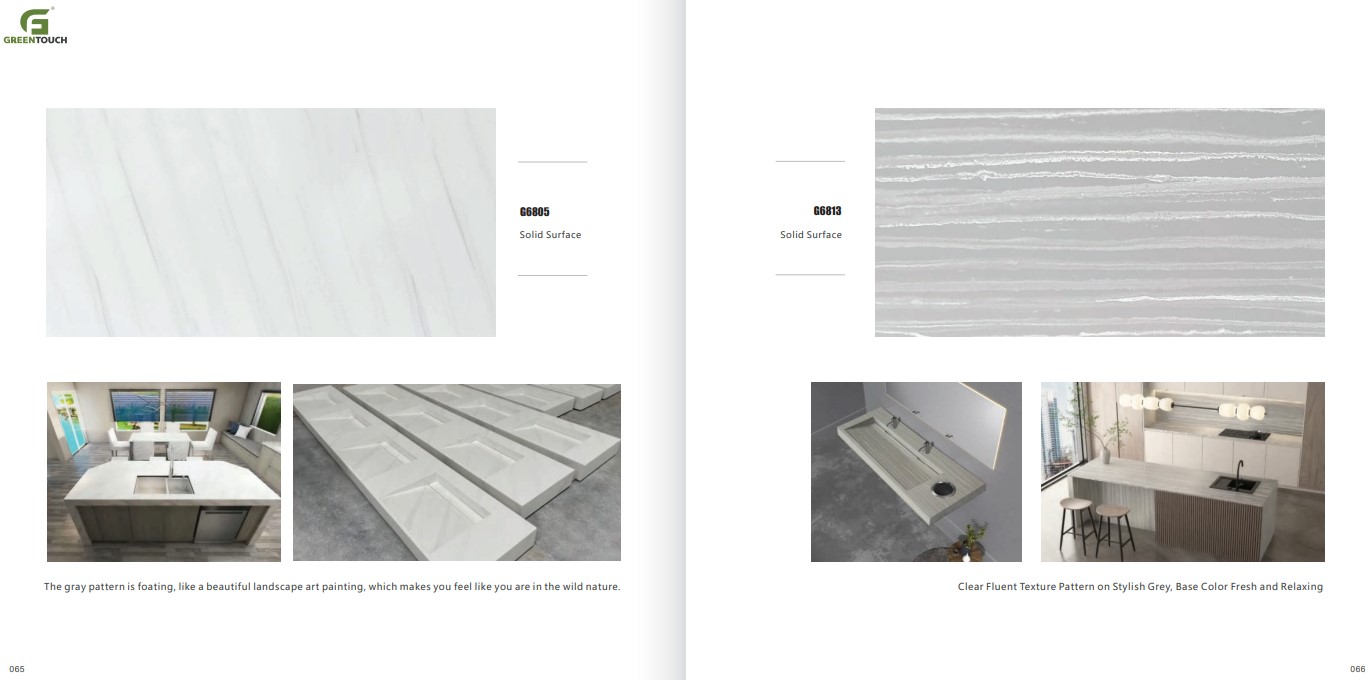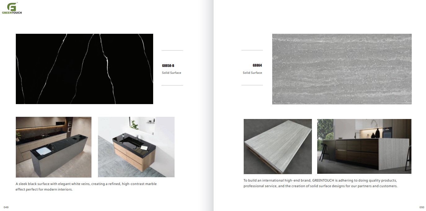 หินสังเคราะห์ยี่ห้อ GREENTOUCH Solid Surface ทำจากอคิลิค 100% ไม่ซึมน้ำ ไม่มีรูพรุน ไม่เป็นที่เพาะเชื้อราแบคทีเรีย ทนสารเคมี สวยงามไร้รอยต่อ มีลวดลายสีสันหลากหลาย