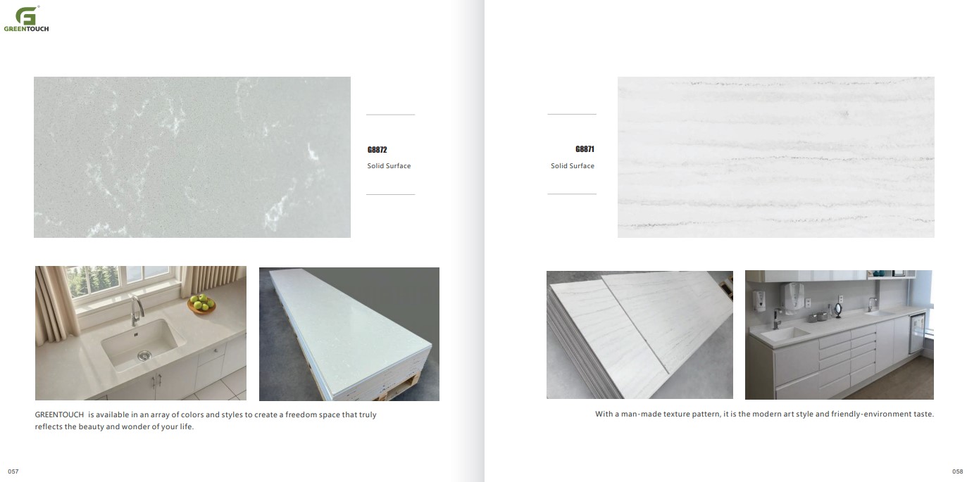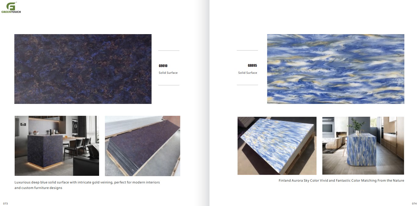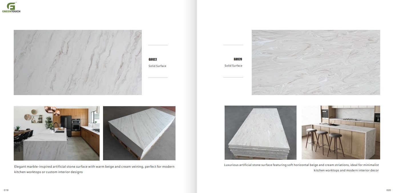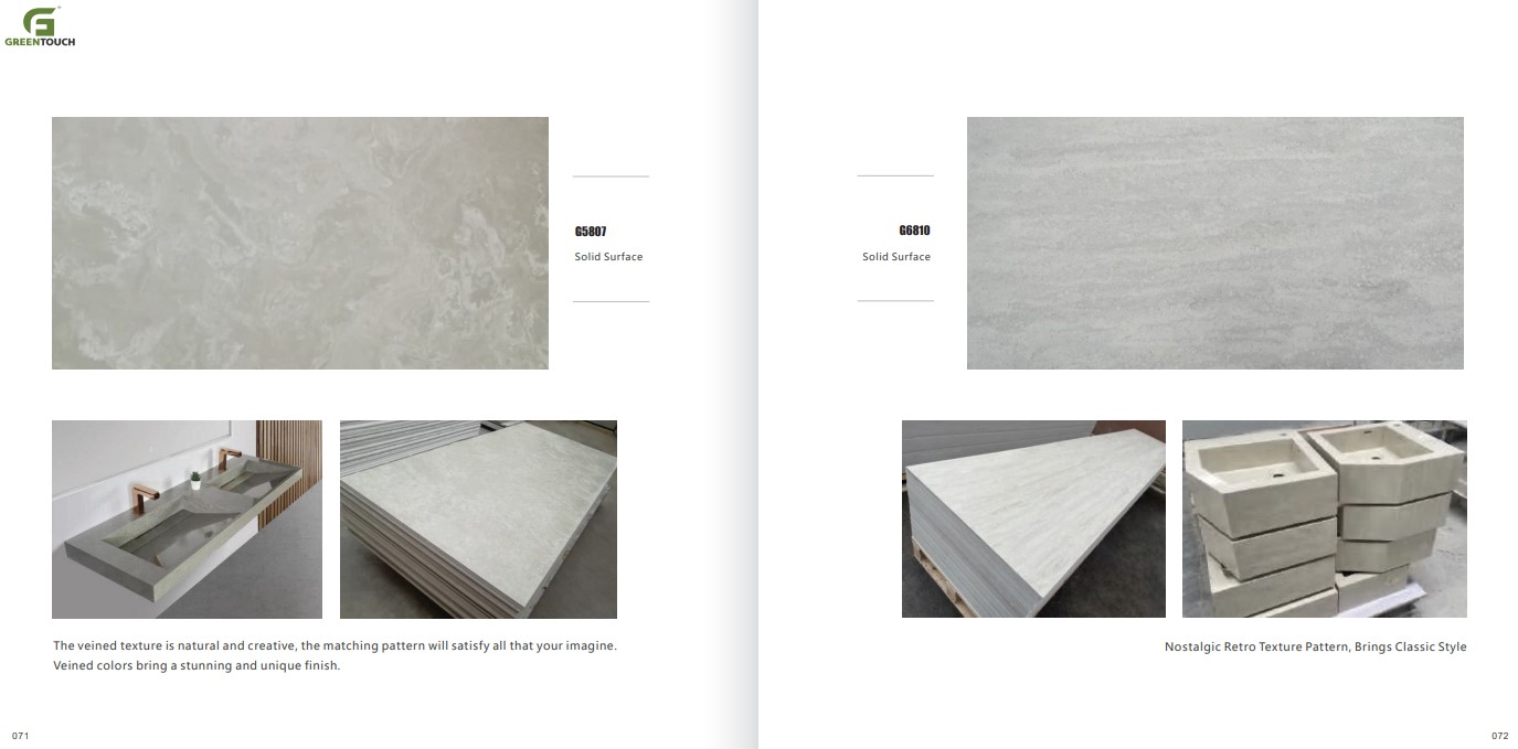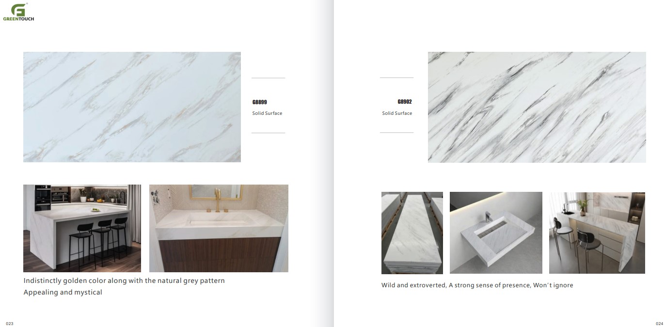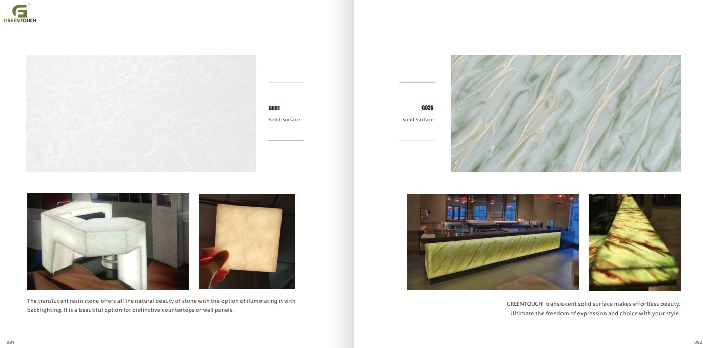 หินสังเคราะห์ยี่ห้อ GREENTOUCH Solid Surface ทำจากอคิลิค 100% ไม่ซึมน้ำ ไม่มีรูพรุน ไม่เป็นที่เพาะเชื้อราแบคทีเรีย ทนสารเคมี สวยงามไร้รอยต่อ มีลวดลายสีสันหลากหลาย