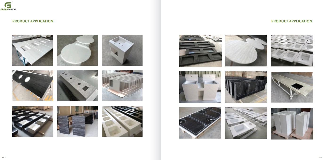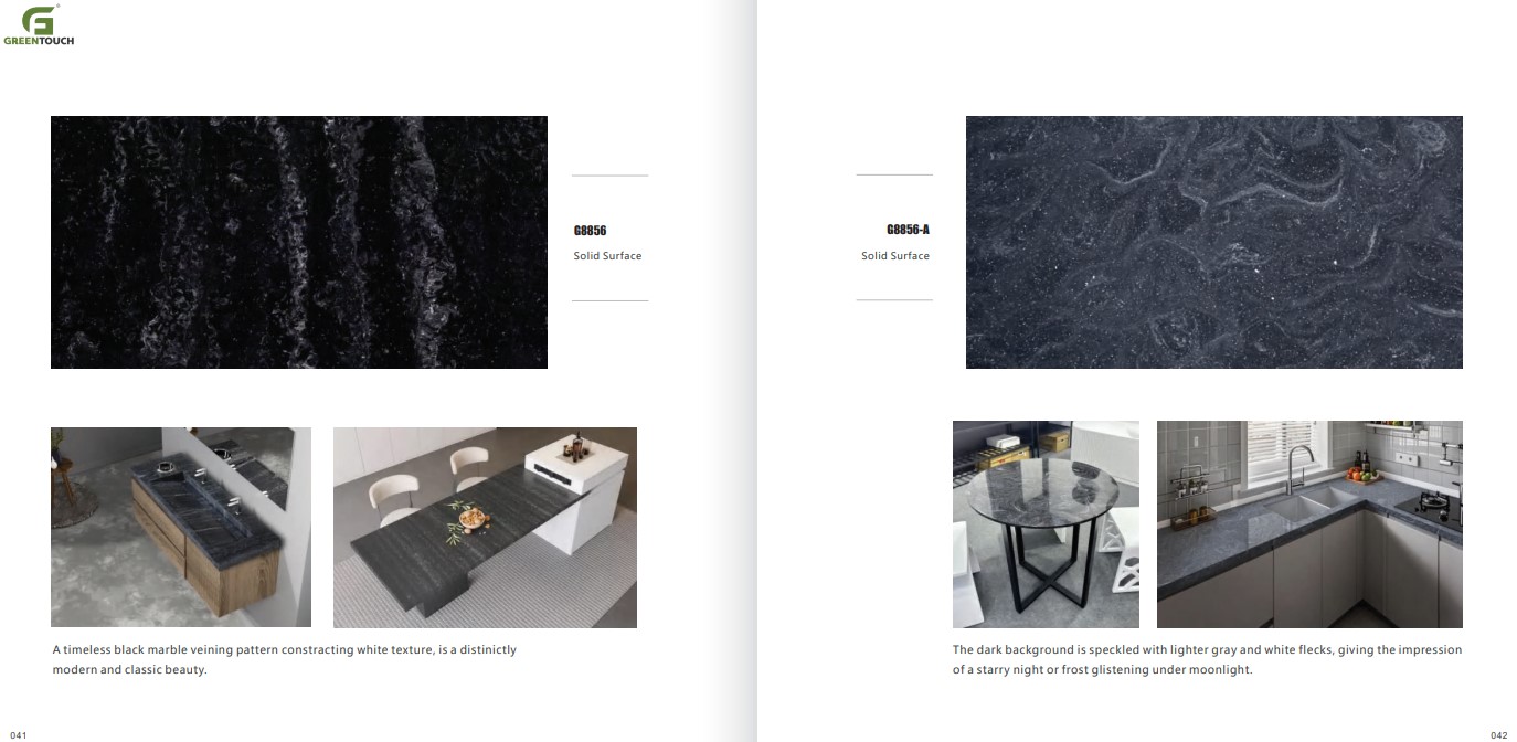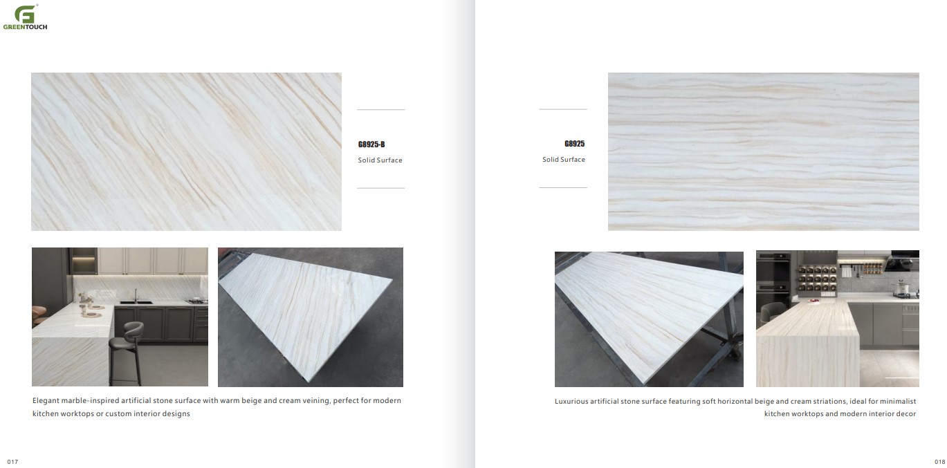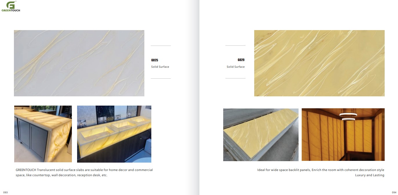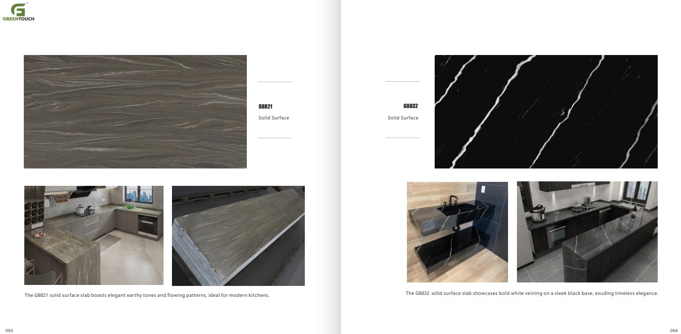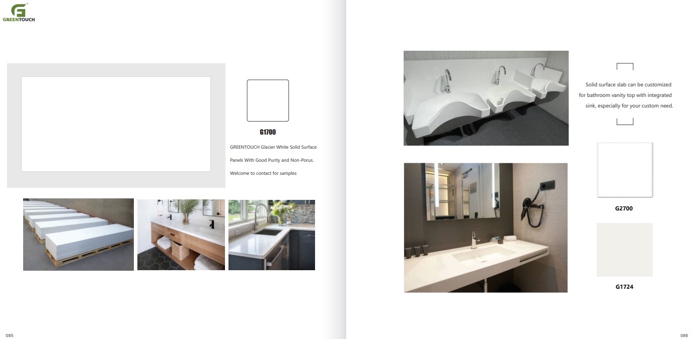 หินสังเคราะห์ยี่ห้อ GREENTOUCH Solid Surface ทำจากอคิลิค 100% ไม่ซึมน้ำ ไม่มีรูพรุน ไม่เป็นที่เพาะเชื้อราแบคทีเรีย ทนสารเคมี สวยงามไร้รอยต่อ มีลวดลายสีสันหลากหลาย