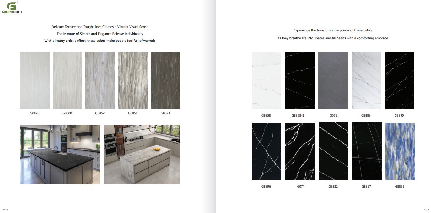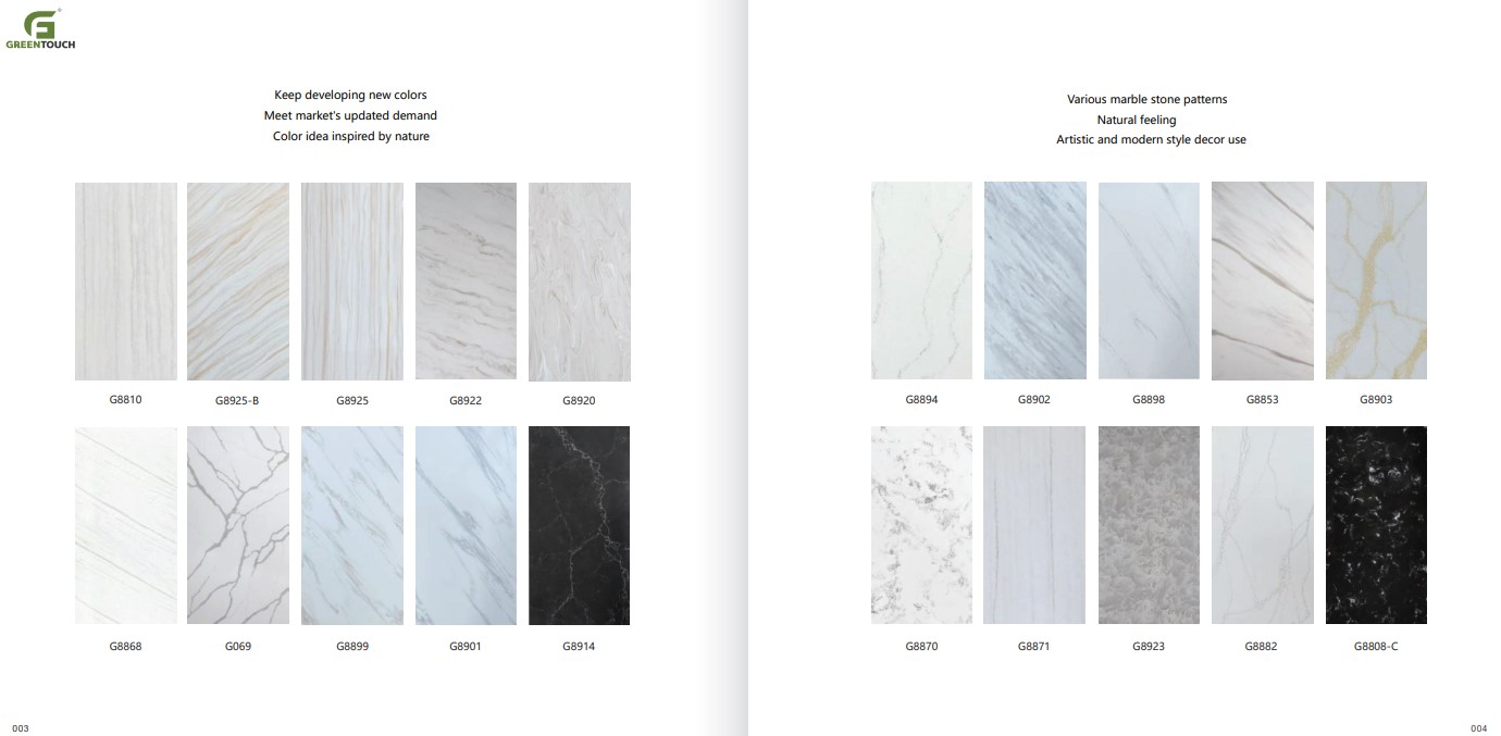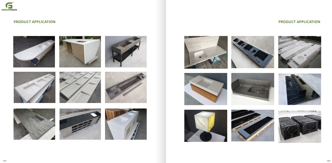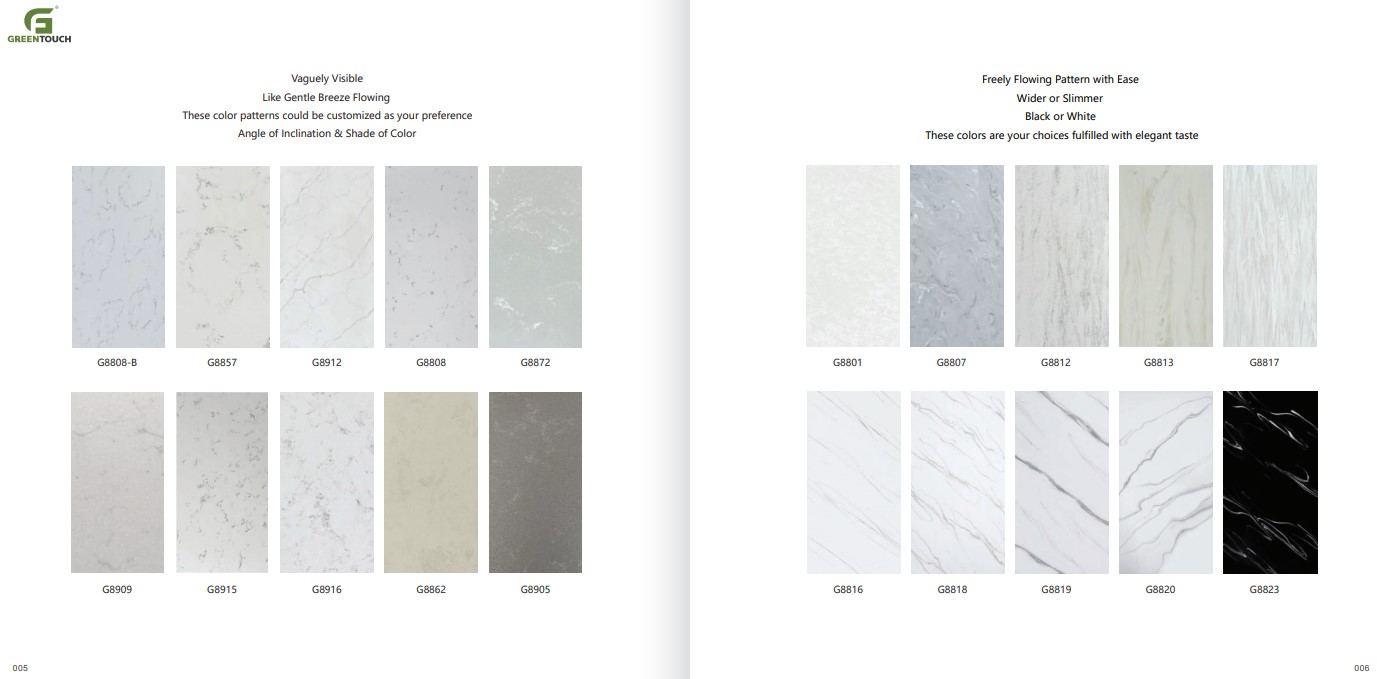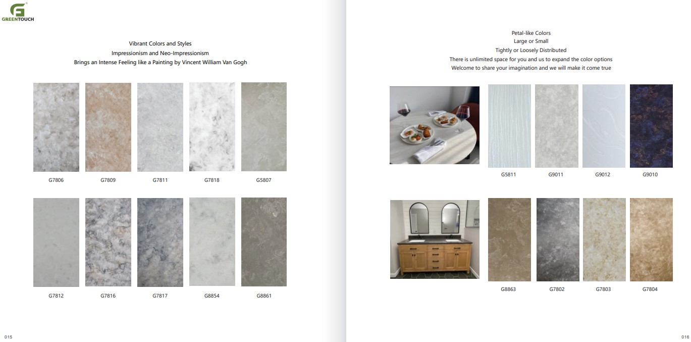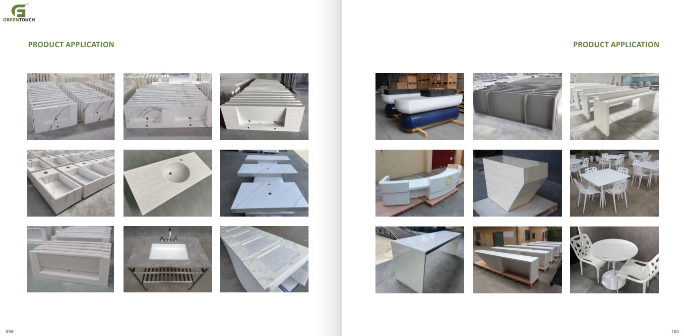 หินสังเคราะห์ยี่ห้อ GREENTOUCH Solid Surface ทำจากอคิลิค 100% ไม่ซึมน้ำ ไม่มีรูพรุน ไม่เป็นที่เพาะเชื้อราแบคทีเรีย ทนสารเคมี สวยงามไร้รอยต่อ มีลวดลายสีสันหลากหลาย